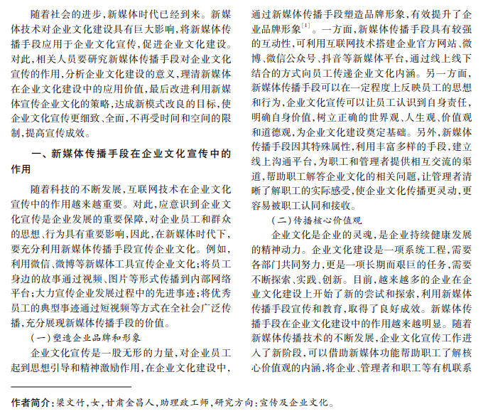 随着新媒体技术的出现,各行业的工作模式发生了明显变化,尤其是企业宣传工作,不仅宣传效率 显著提升,而且衍生了不同的宣传形式,实现了线上线下工作模式的高度融合。但新媒体技术属于全新的体 系,利用其开展工作需要软硬件支持,具有难度。本文分析新媒体传播手段在企业文化宣传中的作用,并提出 融合策略。