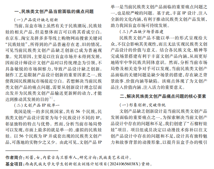 中国作为统一的多民族国家,拥有丰富多样的民族文化资源。民族文化资源不仅是中华文明的重 要组成部分,也是推动经济发展的全新路径。近年来,中国盲盒市场规模呈现持续扩大态势,中国潮玩行业正 逐步走向千亿级别产业行列。新时代青年应以敏锐的嗅觉捕捉当前经济发展趋势,结合国情实际,探寻创新创 业思路。本文以“石榴籽娃娃”为例,探讨基于铸牢中华民族共同体意识的民族类文创产品设计与思考。
