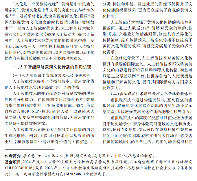 黄河文化是中华文明的重要组成部分,其传播对彰显中华文化的独特魅力和影响力具有重要意 义。近年来,随着人工智能技术迅猛发展,黄河文化的传播方式发生了深刻变革。本文分析人工智能赋能黄河 文化传播的作用机理和现实挑战,有针对性地探究人工智能赋能黄河文化传播的优化路径,提升黄河文化传播 实效。