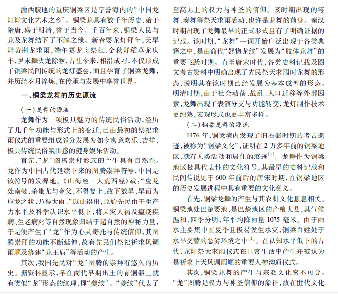 本文以铜梁龙舞为研究对象,探讨其作为非物质文化遗产在全球化语境下的历史流变,通过对龙 文化及铜梁龙舞发展历程溯源,分析在时代发展进程中铜梁龙舞信仰、功能与形式的演变,结合当下文艺发展 态势,探讨保护与传承方式。