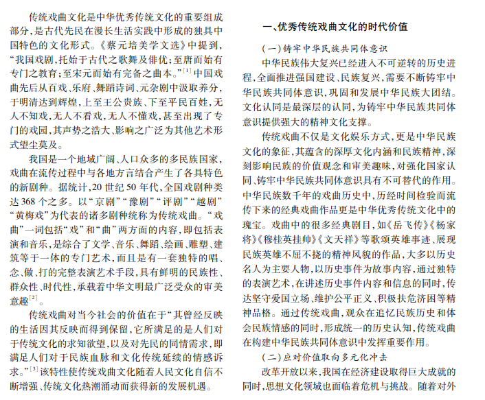 传统戏曲文化具有鲜明的中国特色,对强化国家认同和增强民族凝聚力、应对当前社会价值取向 多元化的冲击、打破“现代化”等于“西方化”的思想桎梏具有重要意义。本文从传统戏曲文化的历史底蕴出发, 提出在当今社会推动传统戏曲文化发展的现实意义,阐明传统戏曲文化发展面临的困境和发展方向。