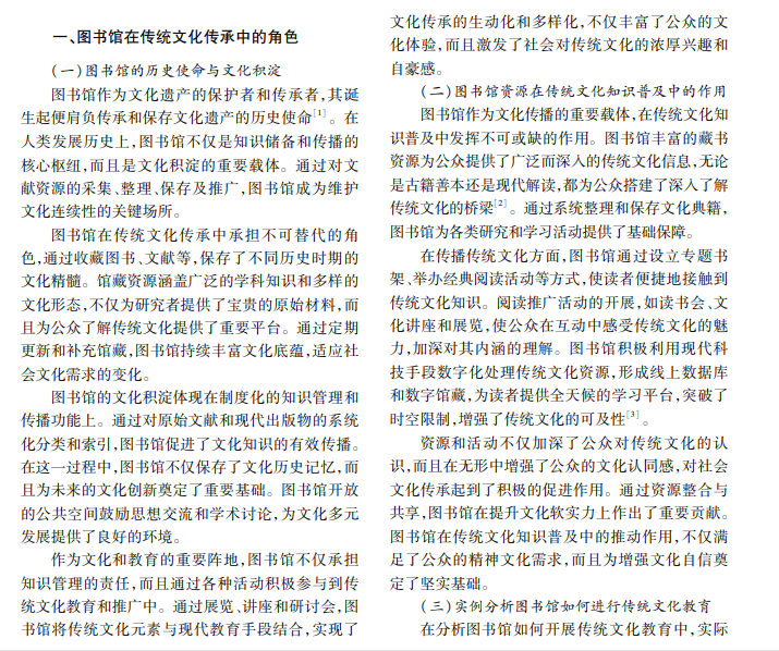 随着数字化时代来临,图书馆作为传统文化信息的重要载体,在全民阅读推广中扮演关键角色。 本文以我国多个城市图书馆为研究对象,通过问卷调查和实地访谈收集数据,分析图书馆在传承和创新传统文 化方面的作用。