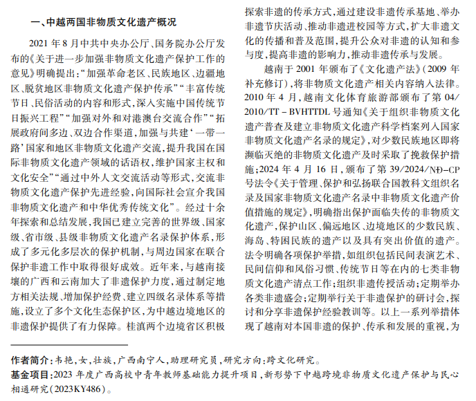 “民心相通”作为“一带一路”建设的重要内容,对促进“一带一路”国家共同发展、推动构建人类命 运共同体具有深远意义。自古以来,由于各民族迁移、民族间交流与融合,中越两国边境地区存在许多同源跨 境民族。在划分国界后,跨境民族跨界而居,文化具有共通性和联系性的特点。本文通过对中越跨境非物质文 化遗产的考察研究,思考如何活化利用跨境非物质文化遗产,促进两国人民民心相通、睦邻友好、共同发展。