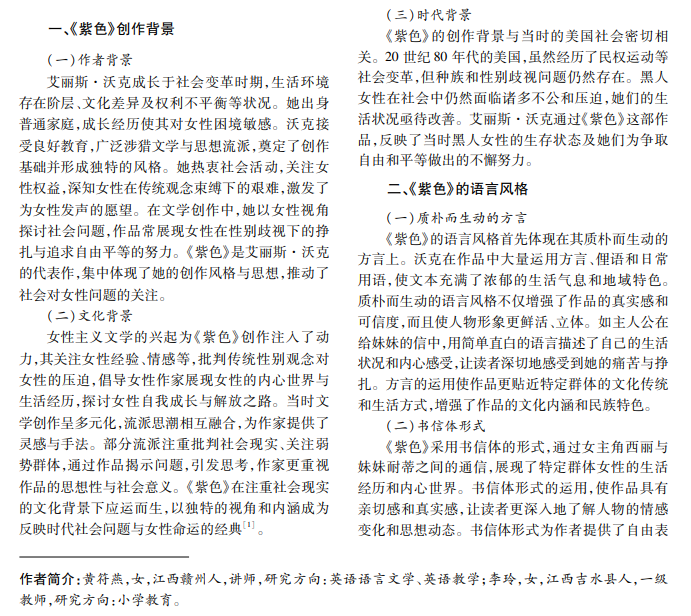 艾丽斯·沃克的著作《紫色》具有深刻的文化内涵、独特的语言风格、强烈的社会责任感,赢得了广 泛赞誉。本文深入分析《紫色》的语言风格和文化内涵,探讨其艺术魅力和思想价值,揭示作品蕴含的社会意义 和人文关怀,以期更好地理解这部作品的艺术魅力和思想价值。
