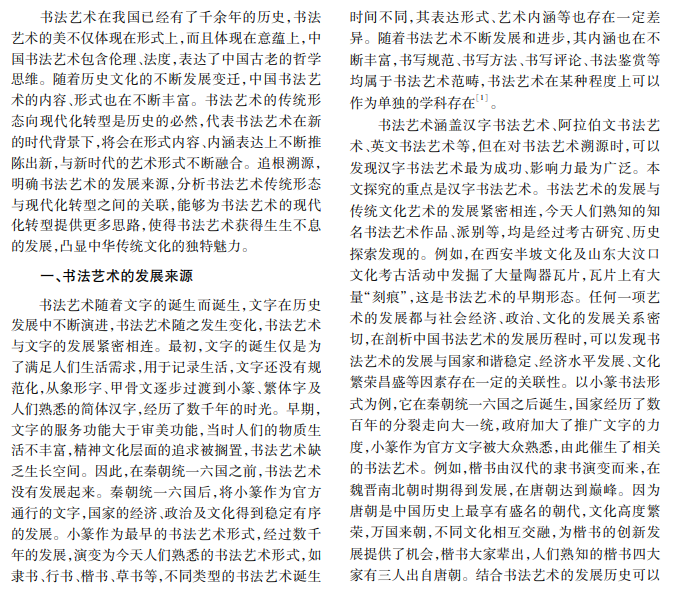 书法是我国传统艺术,历史悠久,包含隶书、草书、行书、楷书等不同流派。随着时代的发展变化, 书法艺术由传统形态积极向现代化转型,呈现多元化发展趋势。本文深度剖析书法艺术的传统形态和现代化 转型问题,以期更好地展现书法艺术的独特魅力。