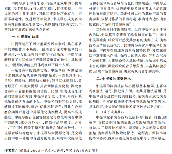 中提琴与小提琴具有相似的外形与结构,相比小提琴,中提琴体积大,音色更醇厚、饱满,独具特 色。无论是在音乐创作中,还是在舞台表演中,中提琴均能发挥特有的音色色彩,塑造不同的音乐风格。研究 中提琴演奏技巧及其音乐表现具有重要意义。本文以中提琴功能分析为切入点,总结中提琴演奏技术,提出提 升中提琴音乐表现力的方法。