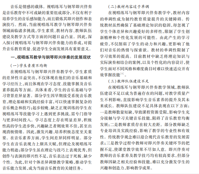 本文指出当前视唱练耳与钢琴即兴伴奏面临的挑战,阐述视唱练耳能力和钢琴即兴伴奏能力养 成所需的理论知识与练习技巧,深入探讨两者能力养成的核心内容及教育教学培养策略,为音乐教育提供有 益参考。