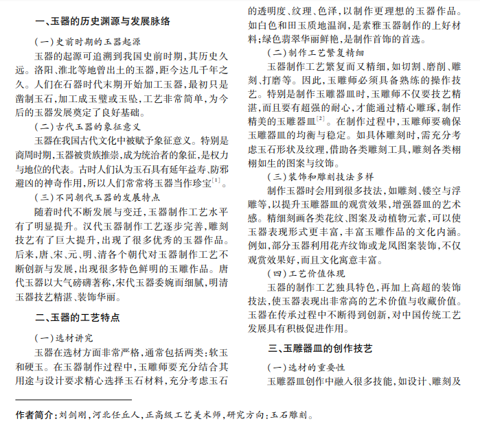 玉器是我国传统工艺中的璀璨明珠,承载中华民族数千年的历史与文化,技艺精湛,具有独特的魅 力,在艺术领域占据重要地位。玉雕器皿作为我国玉器的重要品类之一,具有极高的技艺水平与无穷韵味。本 文结合工作实践,分析和探讨玉器发展及玉雕器皿创作,探讨玉器在弘扬和传承中华优秀传统文化中发挥的重 要作用。