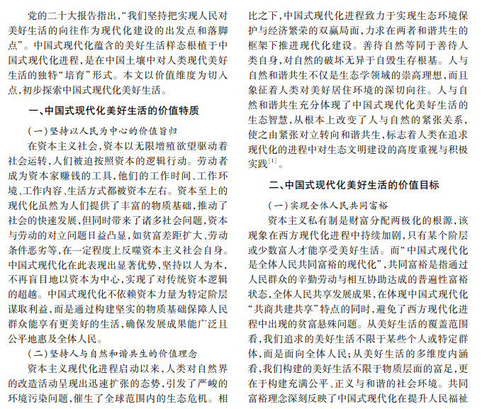 中国式现代化不仅是国家层面的现代化转型,更深层次地关涉到人民美好生活的现代化。中国式 现代化场域中的美好生活坚持以人民为中心、人与自然和谐共生的价值立场,追求实现全体人民共同富裕、物 质文明与精神文明协调发展。本文从价值特质、价值目标、价值取向、价值实现等方面剖析中国式现代化美好 生活的价值意蕴。