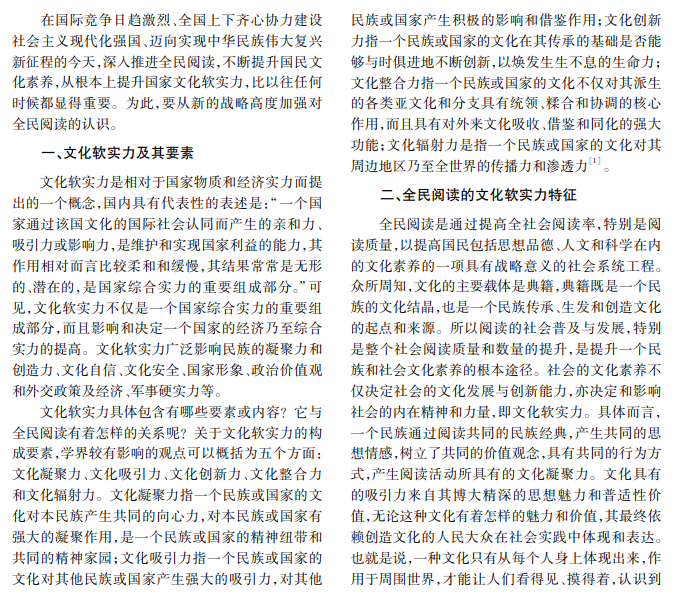 全民阅读是党和国家为建设社会主义现代化强国提出并实施的战略举措,是实现文化强国战略的 重要基础。在全国上下全民阅读不断向纵深推进的今天,深化对全民阅读战略的认识,将全民阅读作为提升我 国文化软实力的重要途径,不仅对深入推进全民阅读具有重要意义,也是提升综合国力的必由之路。