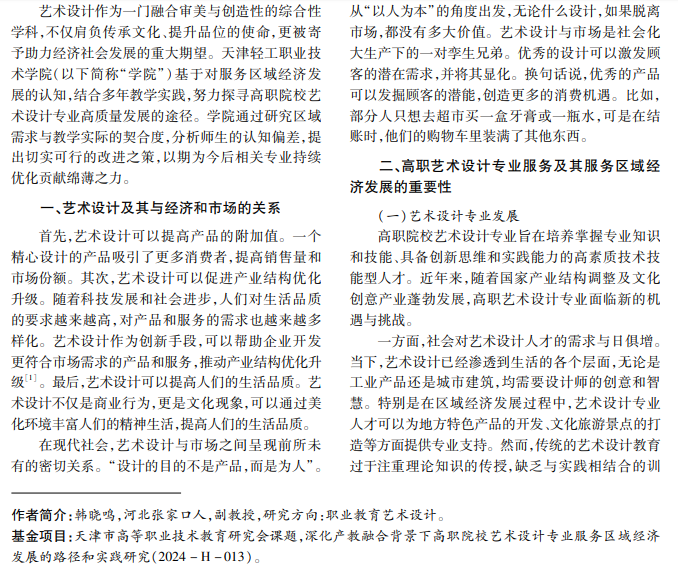 随着我国经济不断发展,艺术设计行业得到越来越多的关注和支持。高职艺术设计专业在服务区 域经济发展中的作用不容小觑。本文从人才培养模式创新、校企深度合作、开放共享教育资源等角度,阐述高 职院校艺术设计专业助力区域经济发展的具体策略,通过产教融合、校地协同等形式,与区域文化创意产业对 接,为地方特色经济注入持久动力。