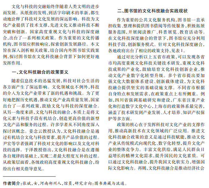 公共图书馆是公共文化服务体系的重要组成部分,担负为公众提供知识资源、开展文化活动、促进 社会教育的责任。近年来,公共图书馆面临数字化、网络化和智能化的多重挑战和机遇。本文结合文化科技融 合的政策要义及政策分析,探讨公共图书馆在文化科技融合方面面临的挑战,提出创新发展策略。