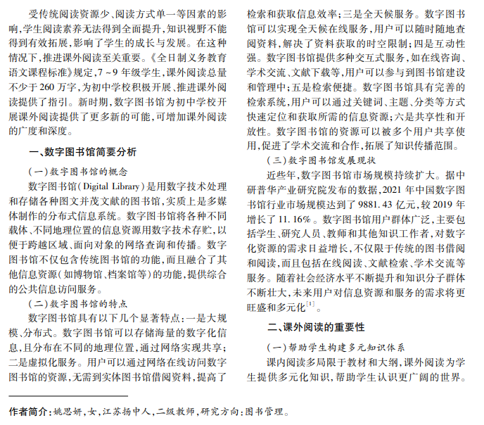 课外阅读是课内阅读的有益补充,对学生阅读能力提升和阅读素养养成具有重要意义。为更好推 进课外阅读,本文基于新时代背景,围绕课外阅读的重要性展开分析,明确数字图书馆在课外阅读中的优势,探 究并总结数字图书馆促进课外阅读的有效路径,旨在提供有益参考。