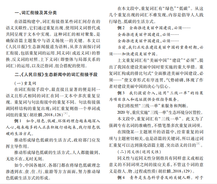 本文选用《人民日报》的生态报道作为研究素材,深入探究与剖析词汇衔接手段。本文依据胡壮麟 的衔接理论,融合其他国内外学者的研究成果,以《人民日报》中的生态新闻为语料,分析词汇衔接中的重复词、 同义性(近同义性)、反义词、上义词(整体 -局部关系)、泛指词、组合搭配的使用。