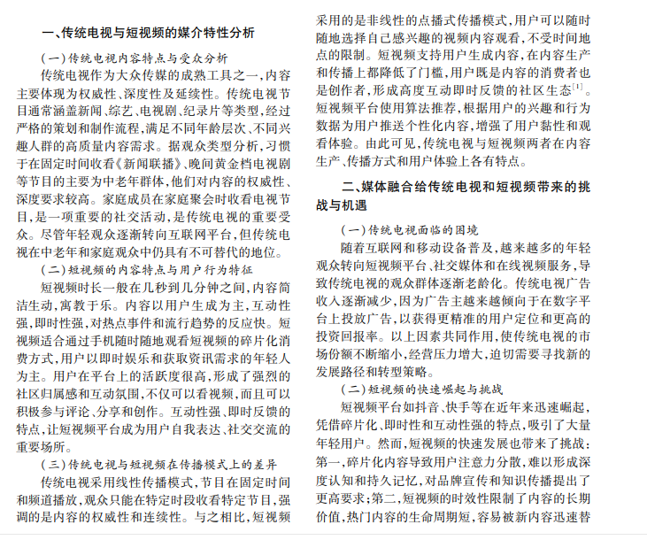 在媒体融合的时代背景下,传统电视与短视频联系日益紧密,同时面临竞争和挑战。本文分析传 统电视和短视频融合带来的挑战和机遇,探讨两者媒体特性和传播模式的差异,随后提出传统电视与短视频协 同发展的策略,为媒体融合发展提供参考。