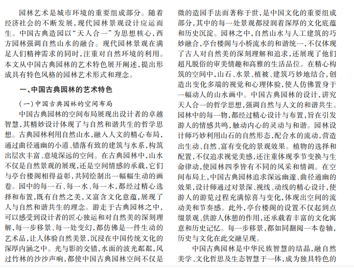 随着社会的不断发展,园林艺术不断进步与创新,园林设计不可或缺。本文介绍了中外古典园林 的艺术特色,阐述了中国古典文化与西方人文特色相结合的古典建筑设计理念,探讨了在园林设计中如何增强 传统艺术应用的同时使现代园林更具民族性和时代感。