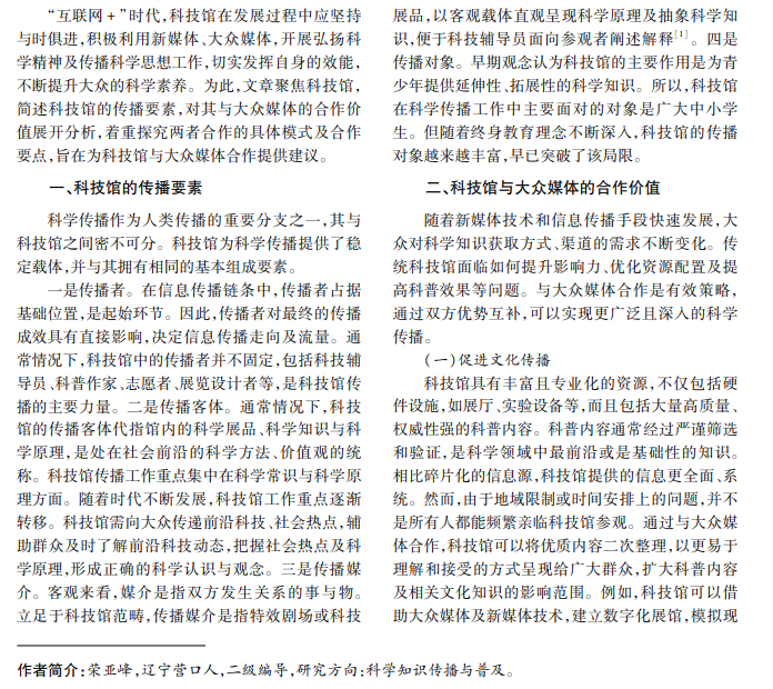 随着社会不断发展,我国已进入知识经济时代。作为承担科普教育职责的主体,科技馆应紧跟时 代发展脚步,充分利用自身资源优势,提升文化科普传播影响力。在全新时代背景下,新媒体呈现蓬勃发展样 态,大众媒体也在不断革新。为此,科技馆需尝试与大众传播媒体联合,探索资源整合、优势整合,充分发挥科 普作用。