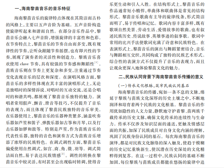 本文探讨海南黎苗音乐在民族认同背景下的创新传承与传播,通过分析黎苗音乐的传承现状、面 临的挑战及创新传播途径,探讨黎苗音乐在民族认同构建中的作用。研究表明,举办文化活动、融合现代元素、 发展文旅产业等措施可以促进黎苗音乐传承与发展。