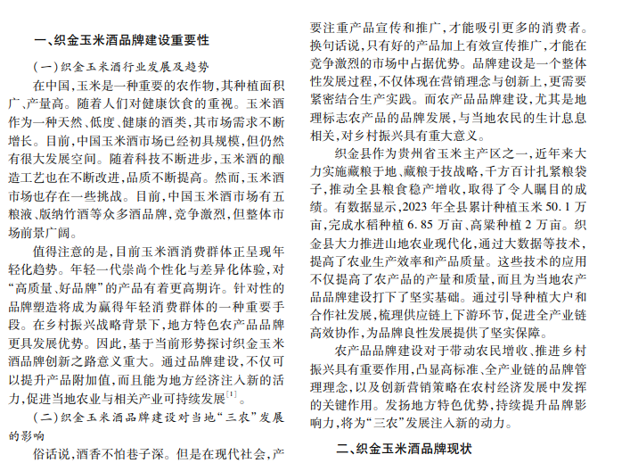 织金玉米酒这一酱香型白酒品牌建设对提升产品附加值、促进地方经济和农业可持续发展至关重 要。本文系统分析该品牌发展历程、现状及市场表现,围绕产品营销、供应链优化等方面提出创新举措,旨在以 品牌建设带动农民增收,推进乡村振兴。