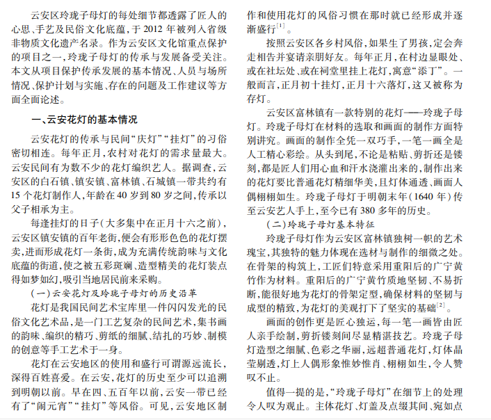云安区隶属广东省云浮市,自然环境别具特色,民俗文化绚丽多彩。其中,云安花灯作为一门综合 的民间艺术,别具一格,集书画的韵味、编织的精巧、剪纸的细腻、结扎的巧妙、制模的创意等手工艺术于一身。 本文分析研究云安玲珑子母灯的历史起源、工艺特征、文化内涵及现状,并探讨当代传承与发展。