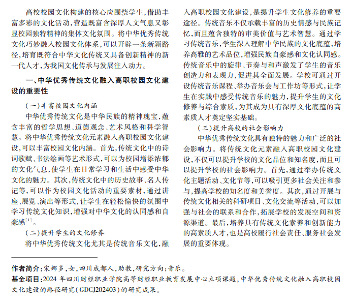中华优秀传统文化是宝贵的精神遗产,对塑造道德与提升修养具有独特价值。在校园文化建设 中,中华优秀传统文化可以引领主流风气,为生活增添色彩,构建积极向上、充满活力的校园文化氛围。本文剖 析中华优秀传统文化融入高职校园文化建设的重要性,探索优秀传统文化与校园文化融合,并提出将中华优秀 传统文化融入校园文化的路径。