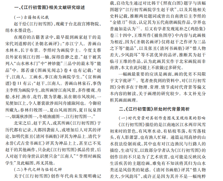 《江行初雪图》诞生于国运苦短、战乱频发的五代南唐,北风吹来的初雪,枯木可堪折,人影萧瑟,正 如风雨飘摇的祖国。山水画之变也于此时发生,笔法的发展、思想的转变,在画面画理上呈现丰富的变化,本文 从《江行初雪图》构图布局、画面语言及手法等角度深入分析这种变化之美。