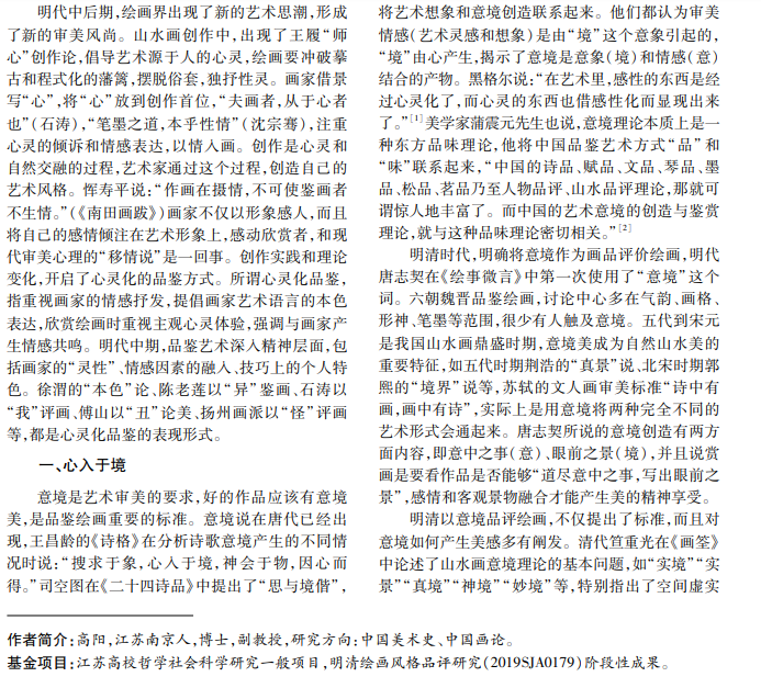 在明清绘画鉴赏中,心灵化品鉴是一种重要的品评形式,其重视画家的情感表达和主观体验。本 文运用“心入于境”“性灵论”“悦性弄情说”“自家面貌论”“笔墨乃性情之事”等理论,阐述明清绘画鉴赏中心灵 化品鉴产生的背景、特点与影响,分析绘画鉴赏中心灵化品鉴及相关理论演变,探讨绘画创作与个性、情感和自 然的深层关系。