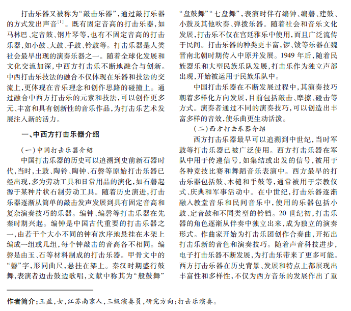 打击乐是音乐的重要组成部分,是全球文化多样性的体现。中西方打击乐融合,不仅促进了不同 地区音乐交流,而且促进了音乐发展。本文介绍中方和西方打击乐历史、发展特点及异同,从演奏技巧、音色方 面说明中西方打击乐的不同,最后以《筑梦深蓝》为例,分析中西打击乐技法融合的应用价值。