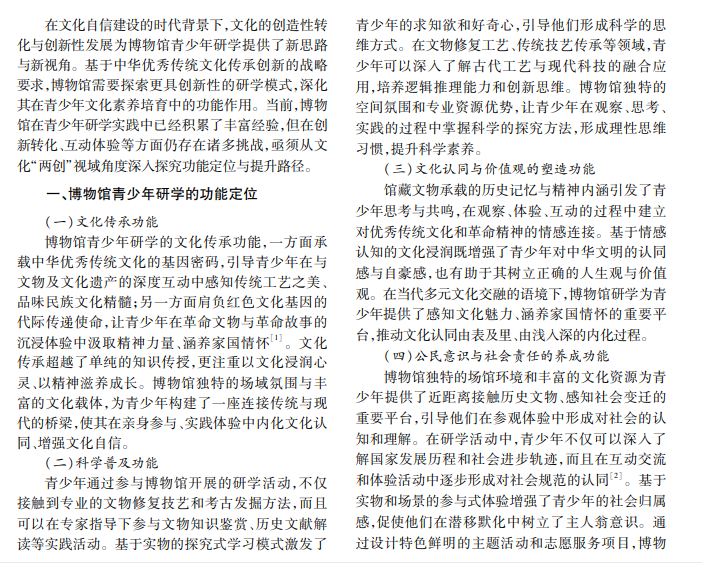 博物馆作为重要的文化载体和社会教育机构,在推动中华优秀传统文化创造性转化、创新性发展 中扮演关键角色。青少年研学是博物馆服务社会、传承文化的重要抓手。本文以文化“两创”视域为切入点,深 入分析博物馆青少年研学的功能定位,揭示其存在的问题,在此基础上提出功能提升路径。