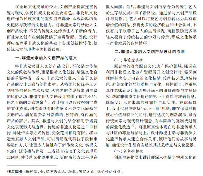 非物质文化遗产丰富的美学价值与文化底蕴为文创产品设计带来全新灵感。通过深入挖掘非遗 元素,结合现代设计理念与技术,文创产品不仅焕发了传统文化活力,而且满足了现代消费者对文化体验和品 质生活的需求。融合策略既重塑了传统文化的表达方式,也拓宽了文创视野和市场潜力。