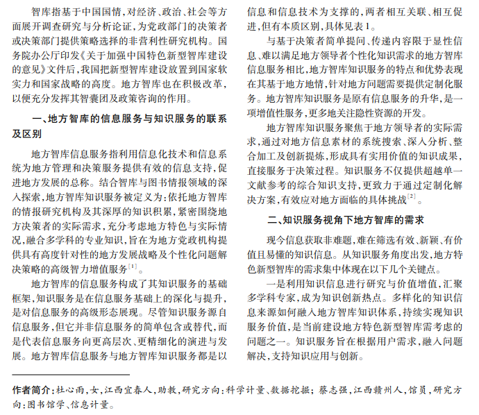 知识经济时代,从知识服务视角思考地方特色新型智库的建设问题,对地方智库发展有重要参考 意义。本文分析地方智库信息服务与知识服务的关系,总结知识服务与地方特色新型智库是耦合共生的关系, 提出促进地方特色新型智库发展的几点建议。