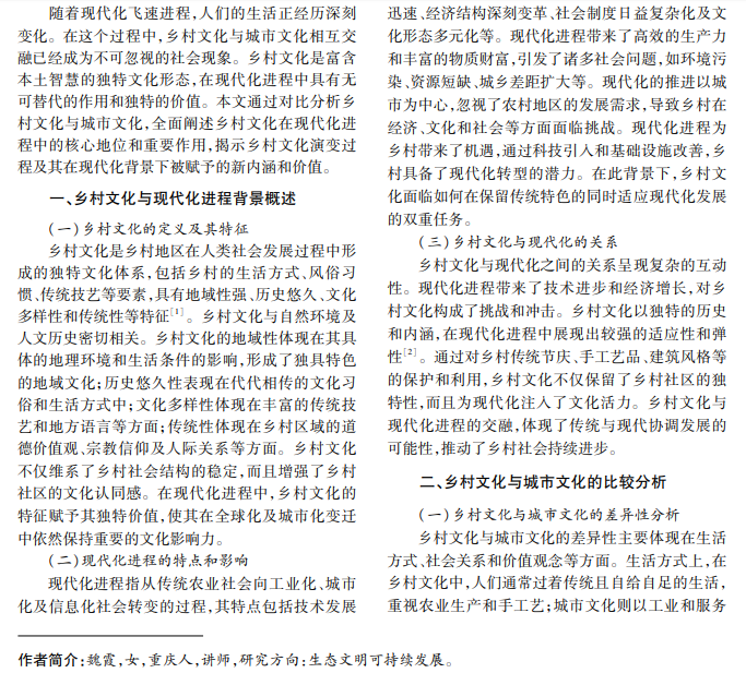 本文深入探讨乡村文化在现代化进程中扮演的角色和作用,首先对比分析乡村文化与城市文化差 异,揭示乡村文化在现代化进程中的独特价值和无可替代的地位;之后提出乡村文化的现代发展模式。本文提 出,乡村文化不仅滋养了农民的精神世界,而且提高了农民的生活质量,引导乡村社会向着更有利的方向发展, 需保护和发展好乡村文化。