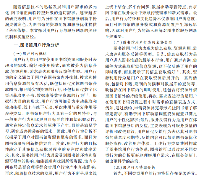 本文围绕图书馆用户行为与服务创新的关系展开研究,通过分析图书馆用户在信息获取、资源利 用、需求表达等方面的行为特征,探索其对图书馆服务创新的影响机制,提出以用户需求为导向的服务创新策略, 包括精准服务模式设计、智能化推荐系统和用户参与机制建设等路径,以增强图书馆核心竞争力与社会价值。