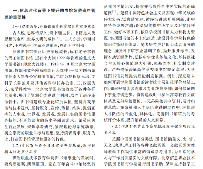 本文以北京信息职业技术学院为例,分析信息时代背景下完善图书馆馆藏资料管理的重要性,阐 述高职院校图书馆管理工作的现状,论述高职院校图书馆管理(“人、机、物、法、环”五要素模型)探索与实践的 方向,阐明高职院校图书馆服务能力的提升是一项多维度工作,涉及资源、服务、管理、技术等各个方面。