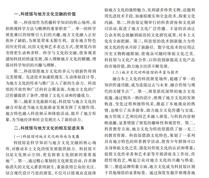 科技馆引导公众深入科学世界,与地方文化交融,能显著增强科普工作的有效性,为地方文化传承 注入活力。地方文化的深厚资源为科技馆的展览及活动提供源源不断的支持,能加深科技馆文化深度和品牌形 象。本文深入研究两者的交融和发展,指出科技馆在助力地域文化传播过程中受文化反哺,形成双向共赢格局。
