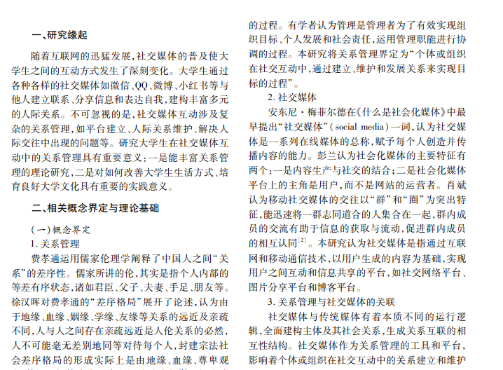 大学生社交媒体的良性关系管理对建设和谐校园至关重要。问卷调查显示,大学生通过社交媒体与家 人、亲密朋友等强关系保持紧密联系,与同学、朋友等弱关系建立松散联系。社会工作介入大学生互动问题的方法: 一是在个体层面提供指导建议,二是在社区层面促进健康社交互动,三是在社会层面倡导平台优化用户体验。