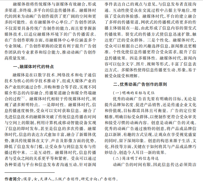 随着信息技术飞速发展,融媒体时代随之到来。在新的时代背景下,动画广告作为信息传播载体 之一,创作方式和传播策略需适应新的媒体环境。融媒体时代具有信息多元化、交互性和即时性特点,如何在 众多信息中脱颖而出,吸引注意力,成为动画广告创作的重要课题。本文从融媒体时代特点出发,探讨优秀动 画广告的创作策略和传播路径。