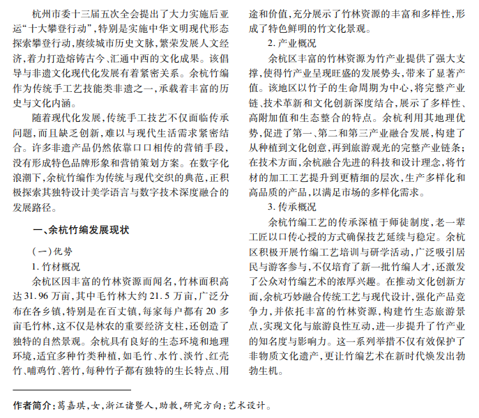 在时代背景下,将余杭竹编传统技艺与现代数字化技术结合,凸显和提升其美学价值,既能拓展创 作空间和表现形式,又能传承和推广竹编艺术,推动个性化定制精准满足市场需求。发展数字时代余杭竹编非 遗文化,是擦亮“书香杭州”名片、讲好杭州故事的重要途径。
