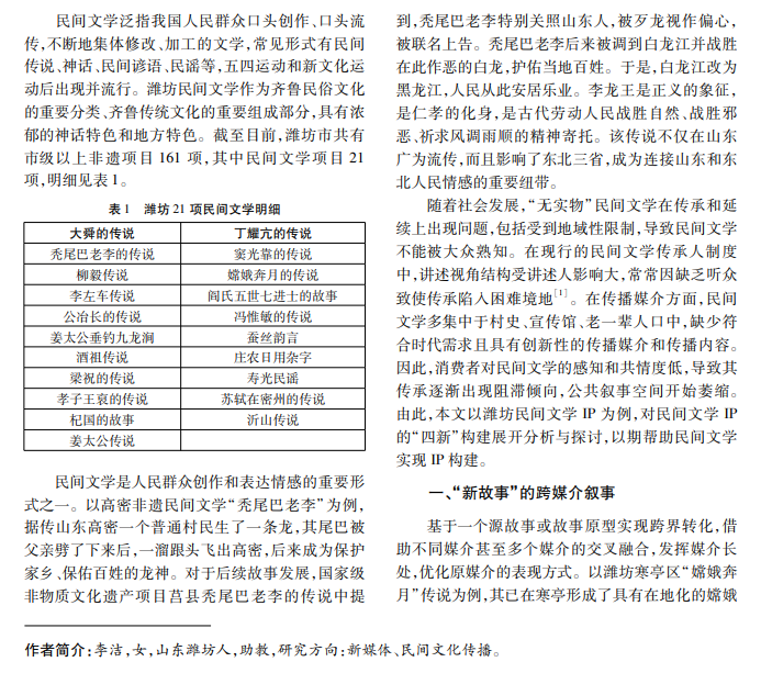 民间文学作为民俗文化的重要组成部分,具有浓郁的神话特色和地方特色,是人民群众表达情感 的重要形式之一。“无实物”的民间文学在传承和延续上出现了民间文学传承人叙事空间萎缩、传播媒介和传 播内容不符合时代需求等问题。本文以潍坊民间文学为例,对民间文学 IP的“四新”构建展开分析与探讨。