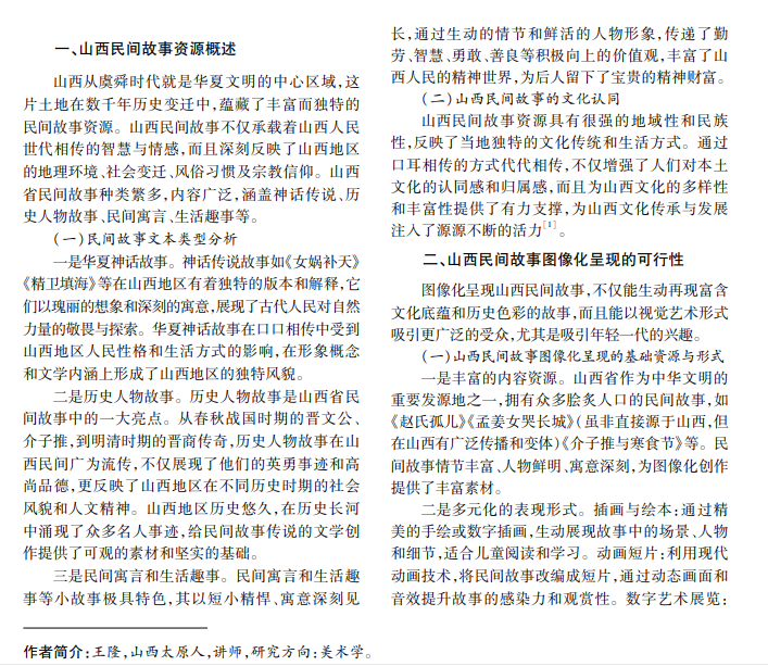 本文通过梳理山西省丰富的民间故事资源,结合插画设计的艺术特性,分析插画在山西民间故事 传播中的独特作用,通过具体案例展示插画设计在故事叙述、情感传达及文化弘扬方面的优势,提出通过插画 设计推广山西民间文化的策略建议,以期为促进山西省非遗文化的传承与发展贡献力量。