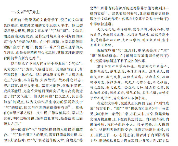 倪岳是天顺八年甲申科庶吉士、茶陵派草创时期的代表人物之一。作为馆阁文人,倪岳文学观念 受台阁影响颇深,如秉持“文以气为主”的散文理念、拥护儒家诗教观。他的散文以理致为中心,又重视从“气” 到“心”的转移。其诗歌强调但又不一味强调“性情之正”,主张“性情之真”;诗歌取向以宗唐为主,重视自然流 丽,反对工巧雕琢。