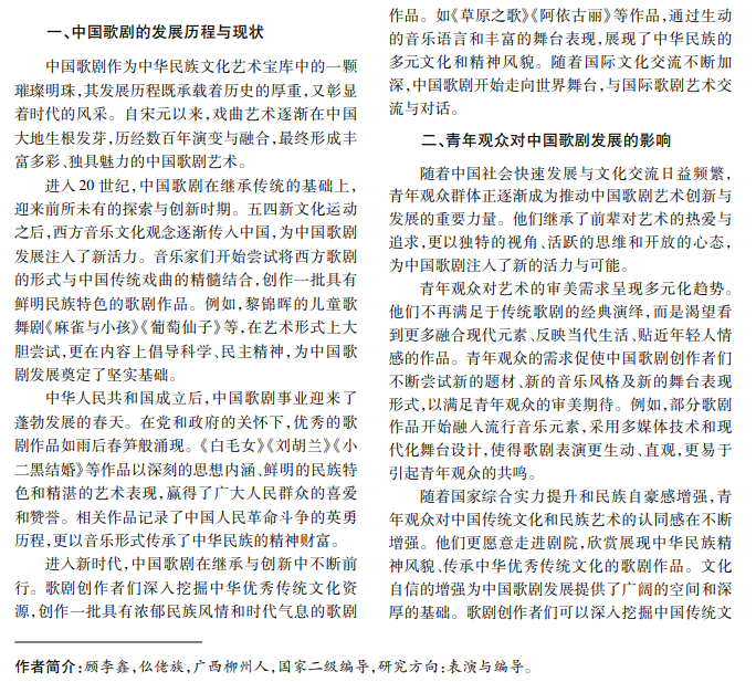 中国歌剧是融合传统与现代艺术元素的独特表演形式,自诞生以来,便承载着讲述中国故事、传递 中华文化的使命。在新时代,青年观众是文化消费的主力军,其审美偏好与价值取向对中国歌剧创作与发展产 生了深远影响。本文探讨中国歌剧创作现状,分析青年观众对中国歌剧发展的影响,根据青年观众的文化消费 特点,提出中国歌剧创作吸引青年观众的策略。