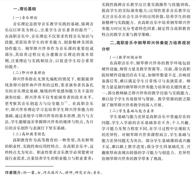 随着音乐文化多元化发展,钢琴即兴伴奏作为音乐表演与创作的重要技能,在高职音乐体系中尤 为重要。当前,钢琴即兴伴奏在课程设置、教学方法、学生基础差异及实践机会等方面仍存在诸多问题,本文深 入探讨高职音乐中钢琴即兴伴奏能力培养现状、面临挑战及应对策略,以期为提升高职中学生钢琴即兴伴奏能 力提供有价值的参考。