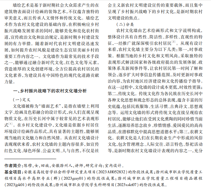 在乡村振兴战略规划推进中,绘画艺术作为通俗易懂的表现形式,对我国乡村文化建设产生了积 极影响,不仅改善了乡村居民的生活环境,而且营造了独具区域特色的农村文化墙艺术环境。本文介绍乡村振 兴视域下文化墙的定义、分类及功能作用,从乡村景观文化墙设计现状入手,探讨乡村振兴战略下皖东农村文 化墙设计方法和有效措施,以期为展现新时代乡村文明提供有力支持。
