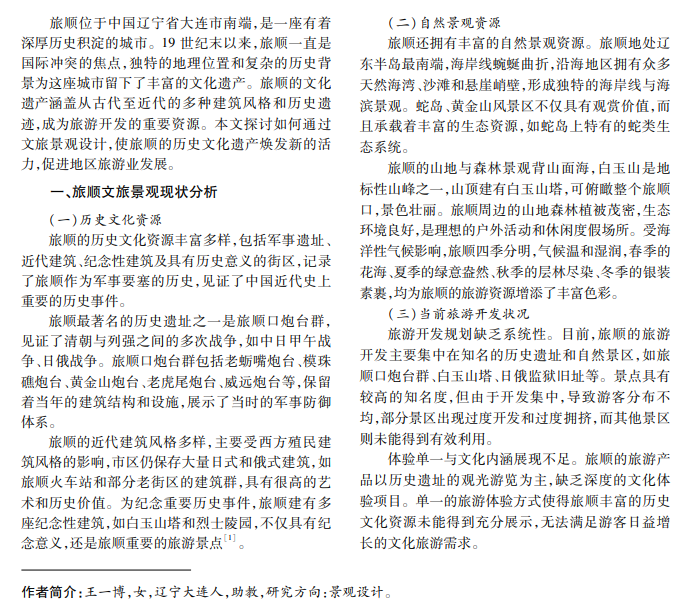 旅顺是中国近代史上重要的军事要塞和文化名城,具有丰富的历史文化遗产和自然资源。本文通 过对旅顺文旅景观的现状分析,探讨文旅景观设计的基本原则和策略,重点分析如何在尊重旅顺历史文化的基础 上,运用现代设计理念与技术,实现文化遗产保护与旅游发展有机结合,提升旅顺文化旅游的吸引力与影响力。