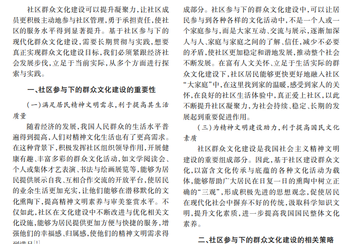 社区作为居民生活的基本单元,也是一个小型社会。在加强我国精神文明建设、促进中国先进文 化发展的目标中,社区也肩负责任与义务。推动社区参与现代群众文化建设,是值得深入思考与探究的课题。 本文阐述基于社区参与的群众文化建设的重要性,从资金支持、制度管理、人员优化等方面提出参考策略。