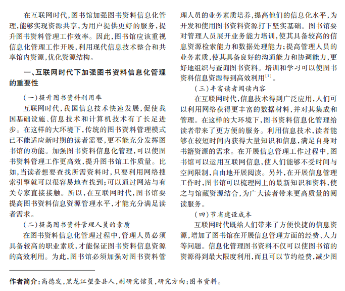 当前,我国在信息化建设方面取得了巨大成就。图书馆作为信息化建设的重要组成部分,在图书 资料管理方面取得了一定进展。随着互联网技术的发展,传统图书馆的服务方式、服务理念、服务模式等已经 不能满足人们日益增长的精神文化需求。传统的图书资料管理工作已无法适应时代发展需求,面临着巨大挑 战。为促进图书馆图书资料信息化管理,提高图书馆服务质量与水平,本文结合互联网时代图书馆图书资料信 息化管理现状,分析其存在的问题及原因并提出对策。