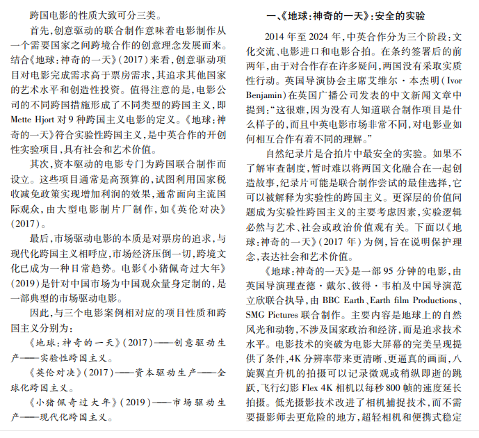 本文通过纪录片电影《地球:神奇的一天》、动作电影《英伦对决》及动画电影《小猪佩奇过大年》三 部中英联合生产电影,分析中英两国如何展开电影联合生产及达到的效果。