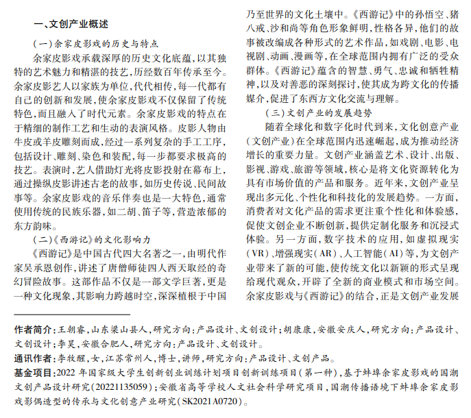 本文聚焦余家皮影戏《西游记》的 IP形象及文创产品设计,通过对余家皮影戏的深入研究,分析其 艺术特点和文化内涵,探讨如何将《西游记》中的元素与皮影戏结合,塑造独特的 IP形象。本文阐述围绕 IP形 象展开的文创产品设计思路、方法和实践过程,希望推动余家皮影戏在现代社会创新发展与传播。