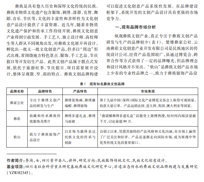 本文通过分析现有彝族文创品牌的市场发展状况,指出彝族文创产品多呈现散点式发展,提出非 遗活态传承下彝族文创品牌构建策略,通过案例分析,总结“彝家礼物”文创品牌构建实践经验,旨在为非遗文 创品牌化发展提供有益参考和启示。